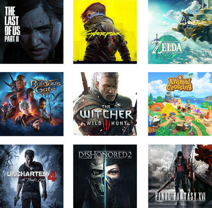 | the last of us series, cyberpunk 2077, the legend of zelda series, baldurs gate 3, the witcher 3, animal crossing series, uncharted series, dishonored series, final fantasy 16 |