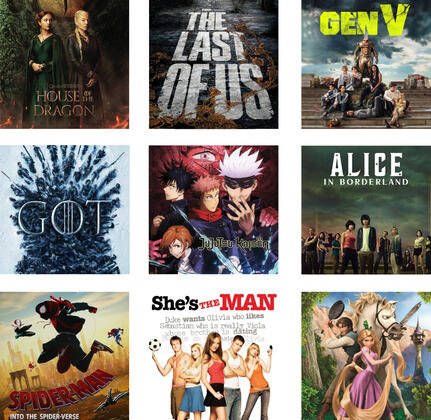 | house of the dragon, the last of us, gen V, game of thrones, jujutsu kaisen, alice in borderland, spider-verse, she's the man, tangled |